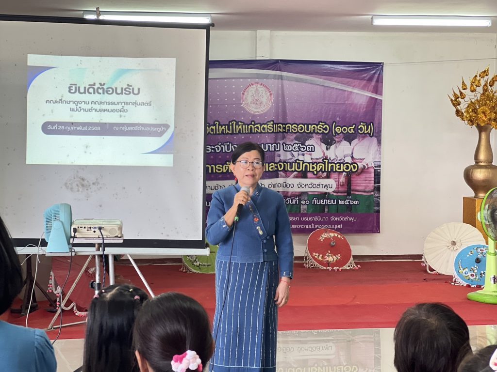 วันที่ 28 กุมภาพันธ์ 2568 นางรชยา ฮั่นตระกูล ผู้อำนวยการศูนย์เรียนรู้การพัฒนาสตรีและครอบครัวเฉลิมพระเกียรติ 72 พรรษา บรมราชินีนาถ จังหวัดลำพูน มอบหมายให้เจ้าหน้าที่ ร่วมให้การต้อนรับคณะศึกษาดูงาน ตามโครงการอบรมและศึกษาดูงานเพิ่มศักยภาพของกลุ่มสตรีแม่บ้าน จากเทศบาลตำบลหนองผึ้ง อำเภอสารภี จังหวัดเชียงใหม่ ณ กลุ่มสลากย้อมประตูป่า ต.ประตูป่า อ.เมือง จ.ลำพูน โดยทางกลุ่มได้แลกเปลี่ยนเรียนรู้การรวมกลุ่มเพื่อประกอบอาชีพในชุมชน และการบริหารจัดการกลุ่มเพื่อให้สมาชิกมีงานและรายได้เสริม เพื่อเป็นแนวทางให้กลุ่มสตรีแม่บ้านนำเอาไปปรับใช้กับกลุ่มอาชีพของตนเองต่อไป
