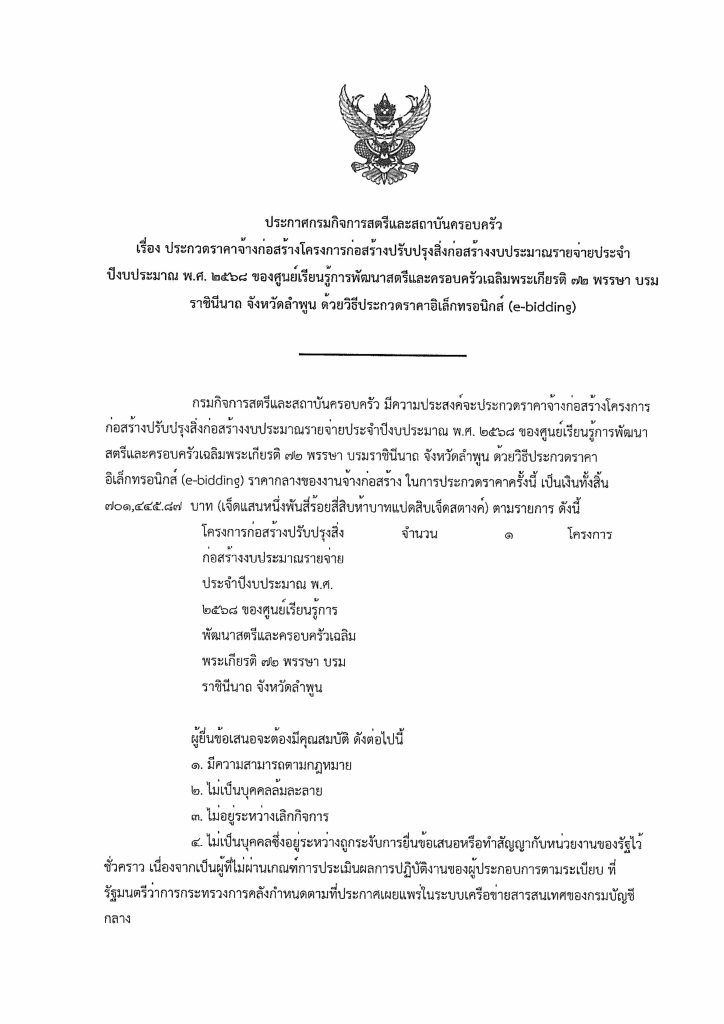 เรื่อง ประกวดราคาจ้างก่อสร้างโครงการก่อสร้างปรับปรุงสิ่งก่อสร้างงบประมาณรายจ่ายประจำปีงบประมาณ พ.ศ. 2568 ของศูนย์เรียนรู้การพัฒนาสตีและครอบครัวเฉลิมพระเกียรติ 72 พรรษา บรมราชินีนาถ จังหวัดลำพูน ด้วยวิธีประกวดราคาอิเล็กทรอนิกส์ (e-bidding)