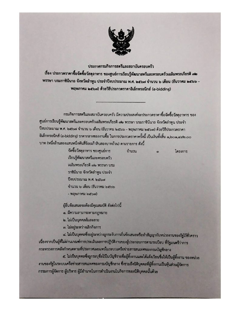 เรื่อง ประกวดราคาซื้อจัดซื้อวัสดุอาหาร ของศูนย์เรียนรู้การพัฒนาสตรีและครอบครัวเฉลิมพระเกียรติ 72 บรรษา บรมราชินีนาถ จังหวัดลำพูน ประจำปีงบประมาณ พ.ศ.2567 จำนวน 6 เดือน (ธันวาคม 2566 – พฤษภาคม 2567)