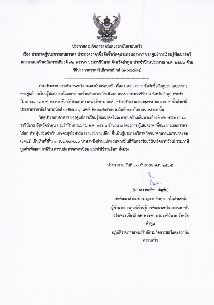 ประกาศกรมกิจการสตรีและสถาบันครอบครัว เรื่อง ประกาศผู้ชนะการเสนอราคา ประกวดราคาชื้อจัดซื้อวัสดุประกอบอาหาร ของศูนย์เรียนรู้การพัฒนาสตรีและครอบครัวเฉลิมพระเกียรติ 72 พรรษา บรมราชินีนาถ จังหวัดลำพูน ประจำปีงบประมาณ พ.ศ. 2566 ด้วยวิธีประกวดราคาอิเล็กทรอนิกส์ (e-bidding)