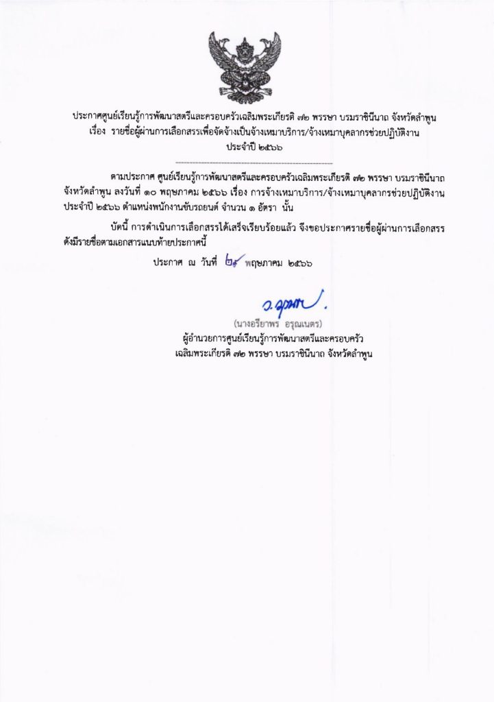 ประกาศศูนย์เรียนรู้การพัฒนาสตรีและครอบครัวเฉลิมพระเกียรติ 72 พรรษา บรมราชินีนาถ จังหวัดลำพูน