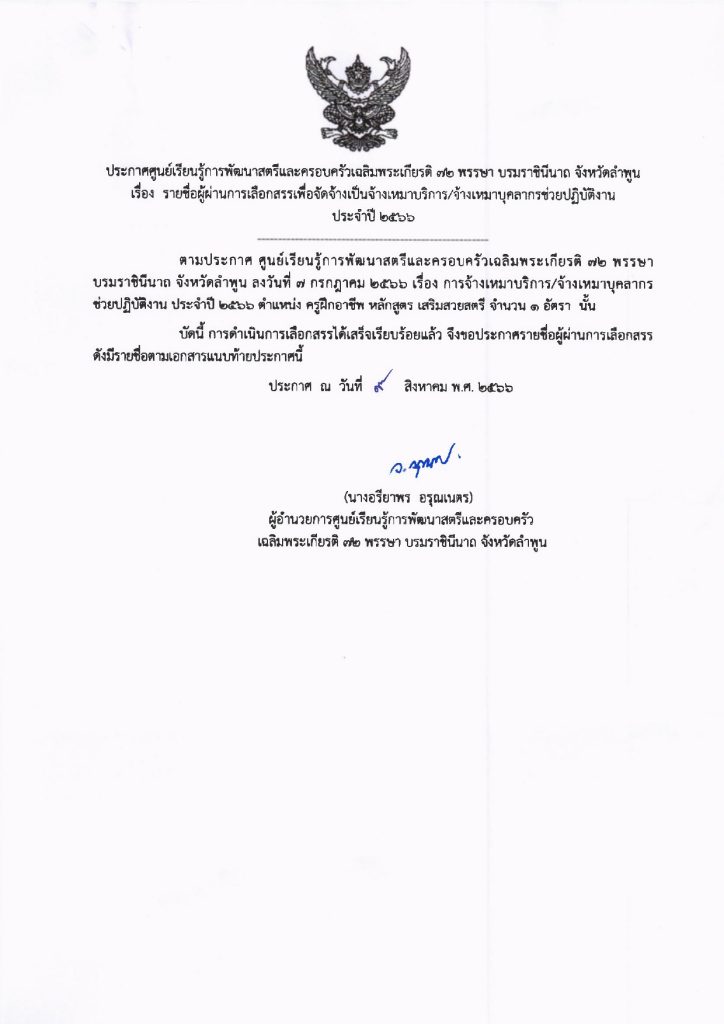 ประกาศศูนย์เรียนรู้การพัฒนาสตรีและครอบครัวเฉลิมพระเกียรติ 72 พรรษา บรมราชินีนาถ จังหวัดลำพูน