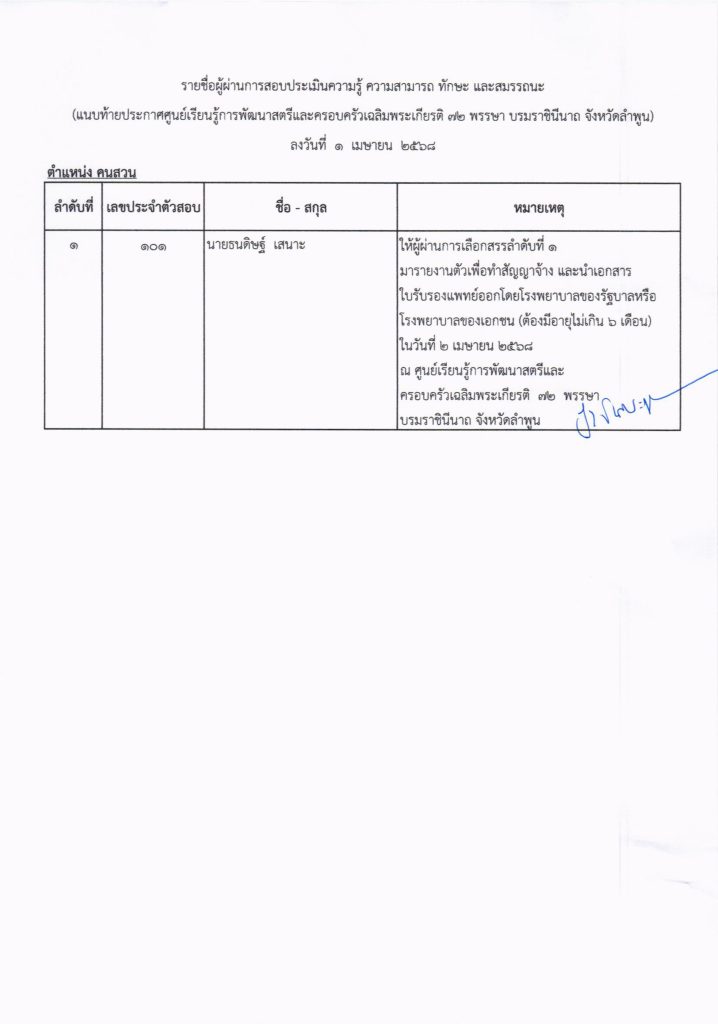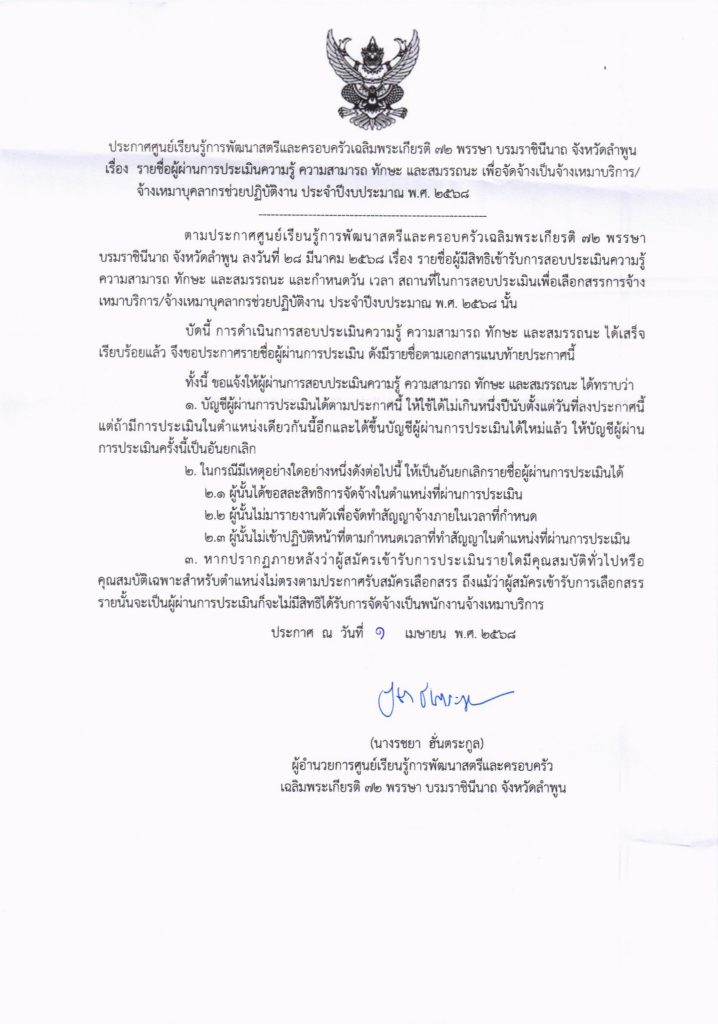 เรื่อง รายชื่อผู้ผ่านการประเมินความรู้ ความสามารถ ทักษะ และสมรรถนะ เพื่อจัดจ้างเป็นจ้างเหมาบริการ/จ้างเหมาบุคลากรช่วยปฏิบัติงาน ประจำปีงบประมาณ พ.ศ.2568