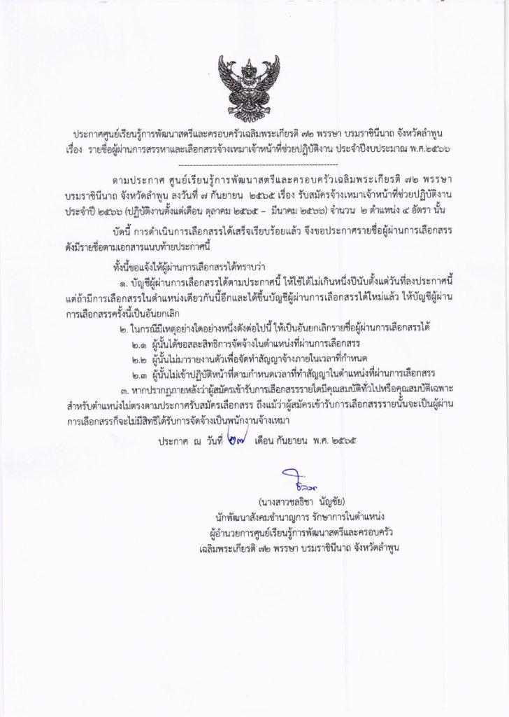 ประกาศศูนย์เรียนรู้การพัฒนาสตรีและครอบครัวเฉลิมพระเกียรติ 72 พรรษา บรมราชินีนาถ จังหวัดลำพูน เรื่อง รายชื่อผู้ผ่านการสรรหาและเลือกสรรจ้างเหมาเจ้าหน้าที่ช่วยปฏิบัติงาน ประจำปีงบประมาณ 2566 รายละเอียดข้อมูลเพิ่มเติมสามารถคลิกได้ที่นี่….. https://drive.google.com/file/d/1srKxjf7KNHTW25xowqA7dcMLCH7UheqQ/view?usp=sharing