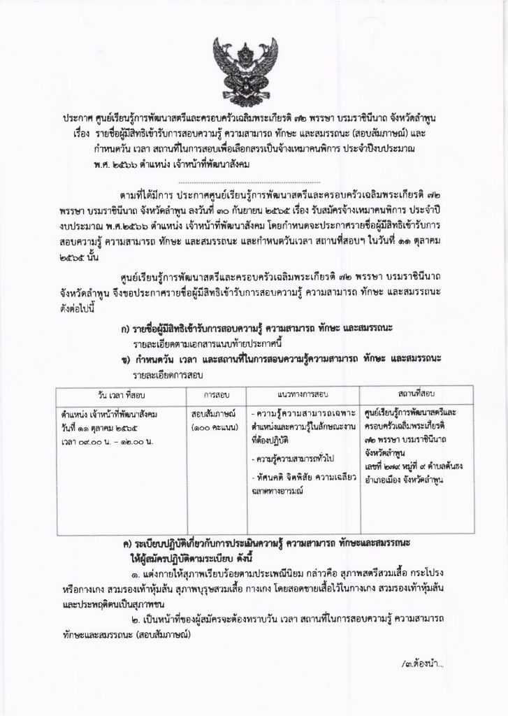 ประกาศศูนย์เรียนรู้การพัฒนาสตรีและครอบครัวเฉลิมพระเกียรติ 72 พรรษา บรมราชินีนาถ จังหวัดลำพูน เรื่อง รายชื่อผู้มีสิทธิเข้ารับการสอบความรู้ ความสามารถ ทักษะ และสมรรถนะ (สอบสัมภาษณ์) และกำหนดวัน เวลา สถานที่ในการสอบเพื่อเลือกสรรเป็นจ้างเหมาคนพิการ ประจำปีงบประมาณ พ.ศ. 2566 ตำแหน่ง เจ้าหน้าที่พัฒนาสังคม