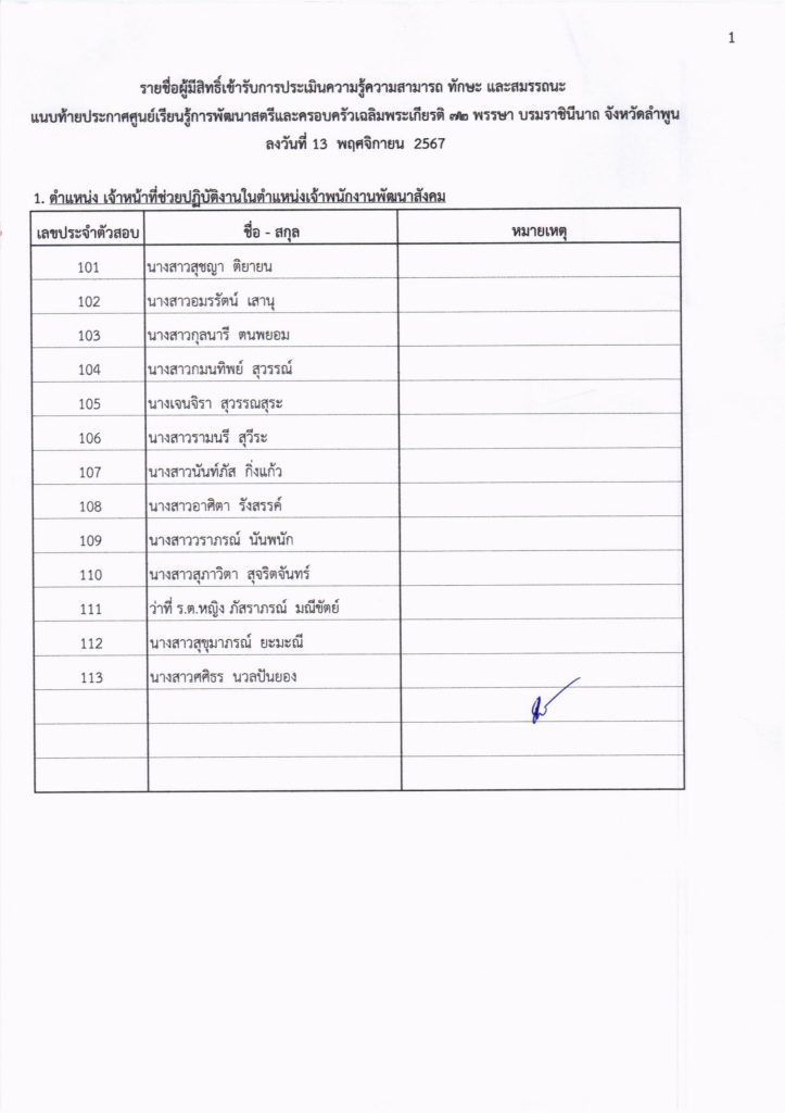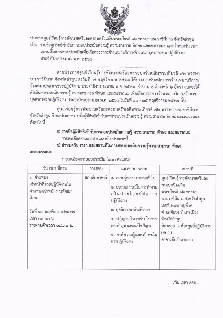 เรื่อง รายชื่อผู้มีสิทธิ์เข้ารับการสอบประเมินความรู้ ความสามารถ ทักษะ และสมรรถนะ และกำหนดวัน เวลา สถานที่ในการสอบประเมินเพื่อเลือกสรรจ้างเหมาบริการ/จ้างเหมาบุคลากรช่วยปฏิบัติงาน ประจำปีงบประมาณ พ.ศ.2568