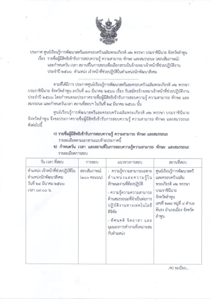 เรื่อง ประกาศรายชื่อผู้เข้ารับการสอบความรู้ ความสามารถ ทักษะ และสมรรถนะ (สัมภาษณ์) และกำหนดวัน เวลา สถานที่ในการสอบเพื่อเลือกสรรเป็นจ้างเหมาเจ้าหน้าที่ช่วยปฏิบัติงานประจำปี 2566 ตำแหน่ง เจ้าหน้าที่ช่วยปฏิบัติในตำแหน่งนักพัฒนาสังคม