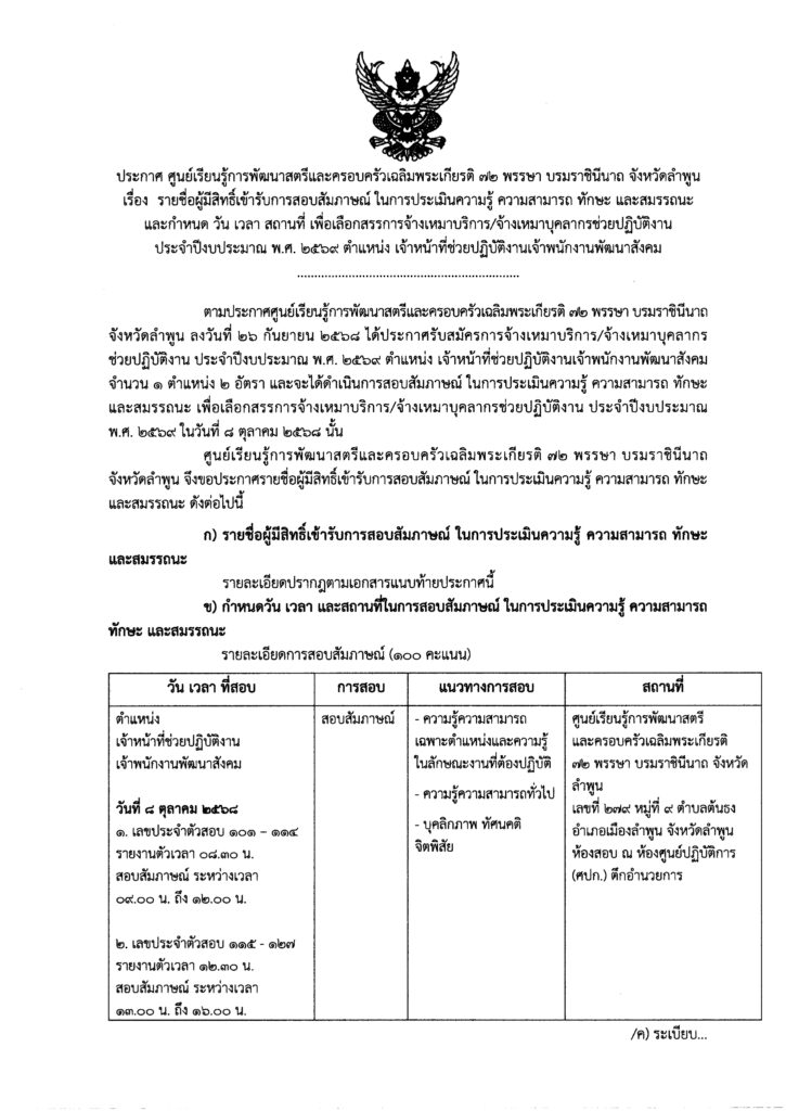 เรื่อง รายชื่อผู้มีสิทธิ์เข้ารับการสอบสัมภาษณ์ ในการประเมินความรู้ ความสามารถ ทักษะ และสมรรถนะ และกำหนด วัน เวลา สถานที่ เพื่อเลือกสรรการจ้างเหมาบริการ/จ้างเหมาบุคลากรช่วยปฏิบัติงาน ประจำปีงบประมาณ พ.ศ.2569