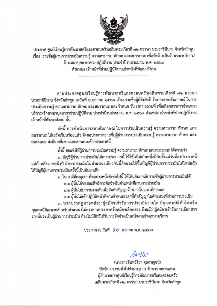 เรื่อง รายชื่อผู้ผ่านการประเมินความรู้ ความสามารถ ทักษะ และสมรรถนะ เพื่อจัดจ้างเป็นจ้างเหมาบริการ/จ้างเหมาบุคลากรช่วยปฏิบัติงาน ประจำปีงบประมาณ พ.ศ.2569