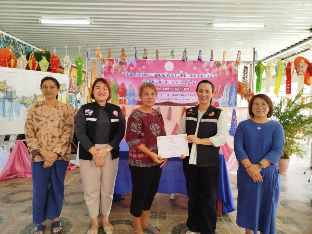วันที่ 7 ธันวาคม 2567 นางรชยา ฮั่นตระกูล ผู้อำนวยการศูนย์เรียนรู้การพัฒนาสตรีและครอบครัวเฉลิมพระเกียรติ 72 พรรษา บรมราชินีนาถ จังหวัดลำพูน มอบหมายให้ข้าราชการและเจ้าหน้าที่กลุ่มส่งเสริมการเรียนรู้และพัฒนาอาชีพ ดำเนินการมอบวุฒิบัตรและปิดกิจกรรมฝึกอบรมอาชีพระยะสั้นในชุมชน (5 วัน) ประจำปีงบประมาณ พ.ศ. 2568 “หลักสูตรการทำโคมล้านนา” จัดขึ้นระหว่างวันที่ 3 – 7 ธันวาคม 2567 ให้แก่สตรีและครอบครัว กลุ่มผู้สูงอายุ ในพื้นที่องค์การบริหารส่วนตำบลแม่ปะ จำนวนทั้งสิ้น 20 คน ในการนี้ได้รับเกียรติจาก นางสาวธนชพร ต๊ะทองคำ นายกองค์การบริหารส่วนตำบลแม่ปะ เป็นประธานในการมอบวุฒิบัตร ณ วัดแม่ปะเหนือ ตำบลแม่ปะ อำเภอแม่สอด จังหวัดตาก
