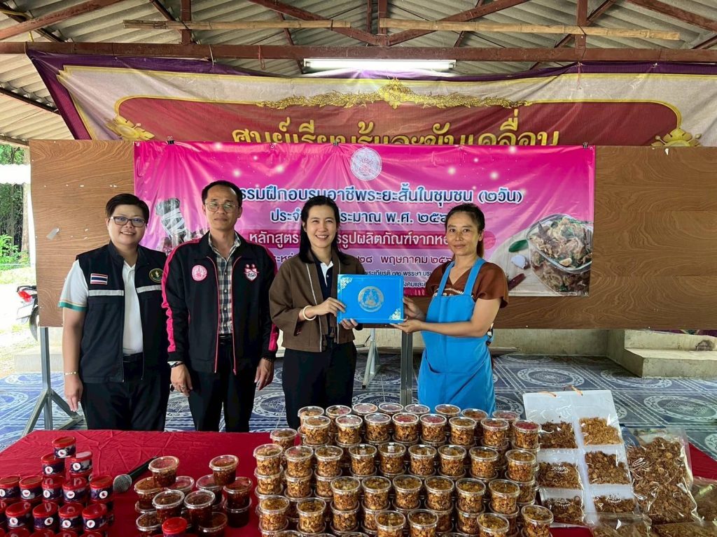 ระหว่างวันที่ 27 – 28 พฤษภาคม 2568 นางรชยา ฮั่นตระกูล ผู้อำนวยการศูนย์เรียนรู้การพัฒนาสตรีและครอบครัวเฉลิมพระเกียรติ 72 พรรษา บรมราชินีนาถ จังหวัดลำพูน มอบหมายให้เจ้าหน้าที่กลุ่มส่งเสริมการเรียนรู้และพัฒนาอาชีพ และกลุ่มส่งเสริมการจัดสวัสดิการสังคม ลงพื้นที่ดำเนินการกิจกรรมฝึกอบรมอาชีพระยะสั้นในชุมชน (2 วัน) ประจำปีงบประมาณ พ.ศ.2568 หลักสูตรการแปรรูปผลิตภัณฑ์จากหอมแดง ของกลุ่มเกษตรกรสมาชิกแปลงใหญ่หอมแดง ในพื้นที่ดูแลของนิคมสร้างตนเองเขื่อนภูมิพล จังหวัดเชียงใหม่ โดยมีการแปรรูปหอมแดงเป็นผลิตภัณฑ์ หอมแดงเจียว/น้ำพริกกากหมู/น้ำพริกเผาหอมแดง/น้ำปลาหวานกะปิ เรียนรู้เทคนิคและวิธีการทำ การบรรจุหีบห่อแพ็คเก็จจิ้ง การคิดคำนวณต้นทุน/กำไร การวางแผนการตลาดและการขายออนไลน์ เพื่อให้สมาชิกเกษตรกรได้เรียนรู้ ลงมือทำ และต่อยอดผลผลิตหอมแดงให้มีมูลค่าที่สูงขึ้น ลดค่าใช้จ่าย เพิ่มรายได้ เกิดความยั่งยืนในชุมชน ทั้งนี้ศูนย์ฯ ได้สัมภาษณ์ข้อมูลประวัติส่วนตัวและครอบครัว เพื่อวางแผนการจัดสวัสดิการด้านสังคมด้วย โดยมีนางสาวพีรดี เหมวิรัช เกษตรอำเภอดอยเต่า เป็นประธานกล่าวเปิดกิจกรรม ณ ศาลากลางหมู่บ้านเกาะหลวง ตำบลโป่งทุ่ง อำเภอดอยเต่า จังหวัดเชียงใหม่