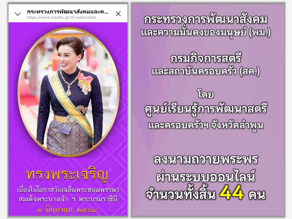 วันที่ 3 มิถุนายน 2568 นางรชยา ฮั่นตระกูล ผู้อำนวยการศูนย์เรียนรู้การพัฒนาสตรีและครอบครัวเฉลิมพระเกียรติ 72 พรรษา บรมราชินีนาถ จังหวัดลำพูน พร้อมด้วยข้าราชการ เเละเจ้าหน้าที่ศูนย์ฯ ร่วมลงนามถวายพระพร ผ่านระบบออนไลน์ กระทรวงการพัฒนาสังคมและความมั่นคงของมนุษย์ สมเด็จพระนางเจ้าฯ พระบรมราชินี เนื่องในโอกาสวันเฉลิมพระชนมพรรษา 3 มิถุนายน 2568 จำนวนทั้งสิ้น 44 คน และได้เผยแพร่ประชาสัมพันธ์ผ่านช่องทางประชาสัมพันธ์ของศูนย์ฯ เพื่อแสดงออกถึงความจงรักภักดี และสำนึกในพระมหากรุณาธิคุณที่มีต่อพสกนิกรชาวไทย เทิดทูนสถาบันพระมหากษัตริย์ ซึ่งเป็นศูนย์รวมจิตใจของคนไทยทั้งชาติ ได้แก่เพจเฟสบุ๊คศูนย์ฯ และเว็บไซต์ของศูนย์ฯ ประชาสัมพันธ์อย่างทั่วถึง
