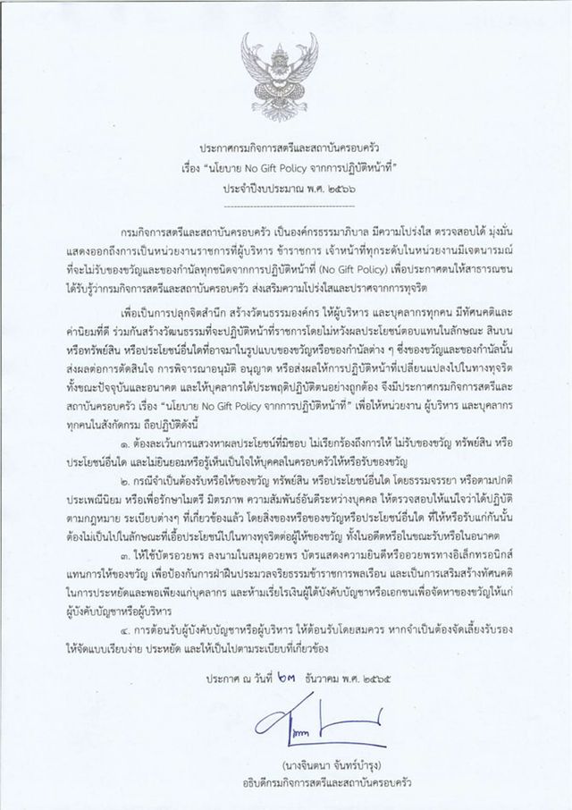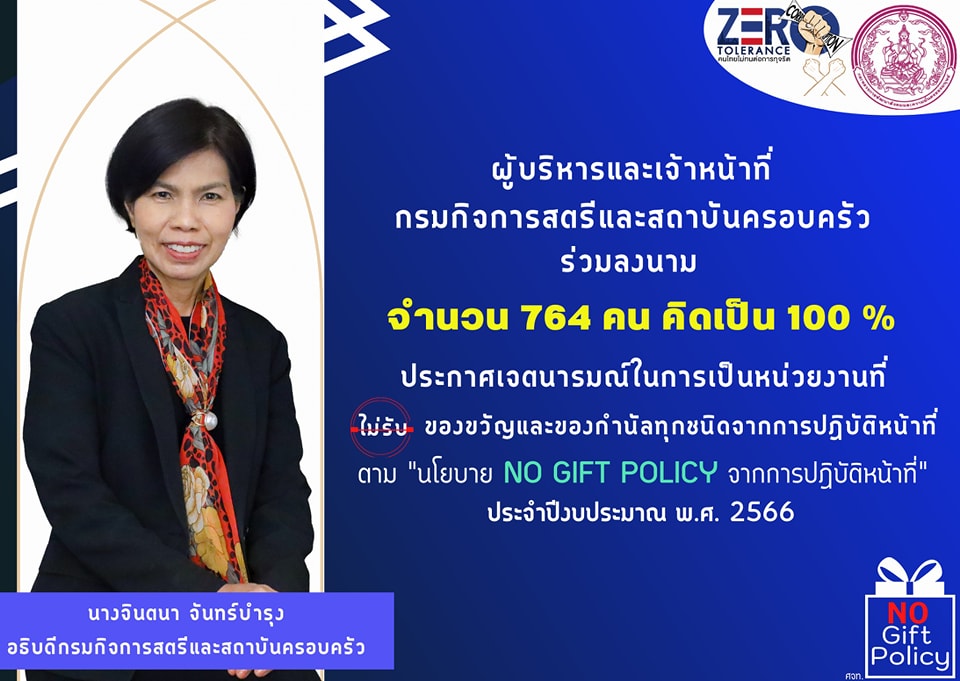 ศูนย์เรียนรูู้การพัฒนาสตรีและครอบครัวฯ จังหวัดลำพูน ร่วมประกาศเจตนารมณ์ ตาม “นโยบาย No Gift policy จากการปฏิบัติหน้าที่” ประจำปีงบประมาณ พ.ศ. 2566ศูนย์เรียนรูู้การพัฒนาสตรีและครอบครัวฯ จังหวัดลำพูน