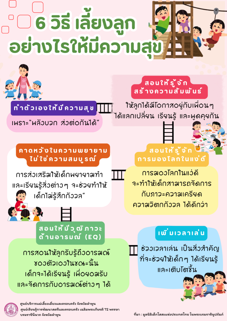 สาระน่ารู้จากศูนย์บริการแม่เลี้ยงเดี่ยวและครอบครัว วันนี้ขอเสนอ “6 วิธี เลี้ยงลูกยังไงให้มีความสุข” วิธีง่ายๆที่คุณพ่อ คุณแม่ทุกคนทำได้แน่นอน
