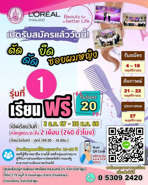 📣💈มาเรียนกันเน้อ สร้างมืออาชีพด้านเสริมสวยครบวงจร สุดปัง!! 🤝โดยความร่วมมือระหว่าง บริษัท ลอรีอัล (ประเทศไทย) จำกัด กับ กรมกิจการสตรีและสถาบันครอบครัว กระทรวงพัฒนาสังคมและความมั่นคงของมนุษย์ เรียน (ฟรี)….มีอาชีพ ได้ที่ศูนย์สตรีฯ 72 พรรษา ลำพูน