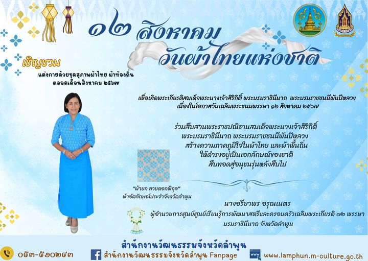 📌📌 นางอรียาพร อรุณเนตร ผู้อำนวยการศูนย์ศูนย์เรียนรู้การพัฒนาสตรีและครอบครัวเฉลิมพระเกียรติ ๗๒ พรรษา บรมราชินีนาถ จังหวัดลำพูน เชิญชวนแต่งกายด้วยชุดสุภาพผ้าไทย ผ้าท้องถิ่น หรือเสื้อผ้าที่เป็นอัตลักษณ์ของท้องถิ่น ตลอดเดือนสิงหาคม ๒๕๖๗ สืบสานพระราชปณิธานสมเด็จพระนางเจ้าสิริกิติ์ พระบรมราชินีนาถ พระบรมราชชนนีพันปีหลวง สร้างความภาคภูมิใจในผ้าไทยและผ้าพื้นถิ่น ให้ดำรงอยู่เป็นเอกลักษณ์ของชาติ สืบทอดสู่อนุชนรุ่นหลังสืบไป เนื่องในวันผ้าไทยแห่งชาติ ๑๒ สิงหาคม ๒๕๖๗
