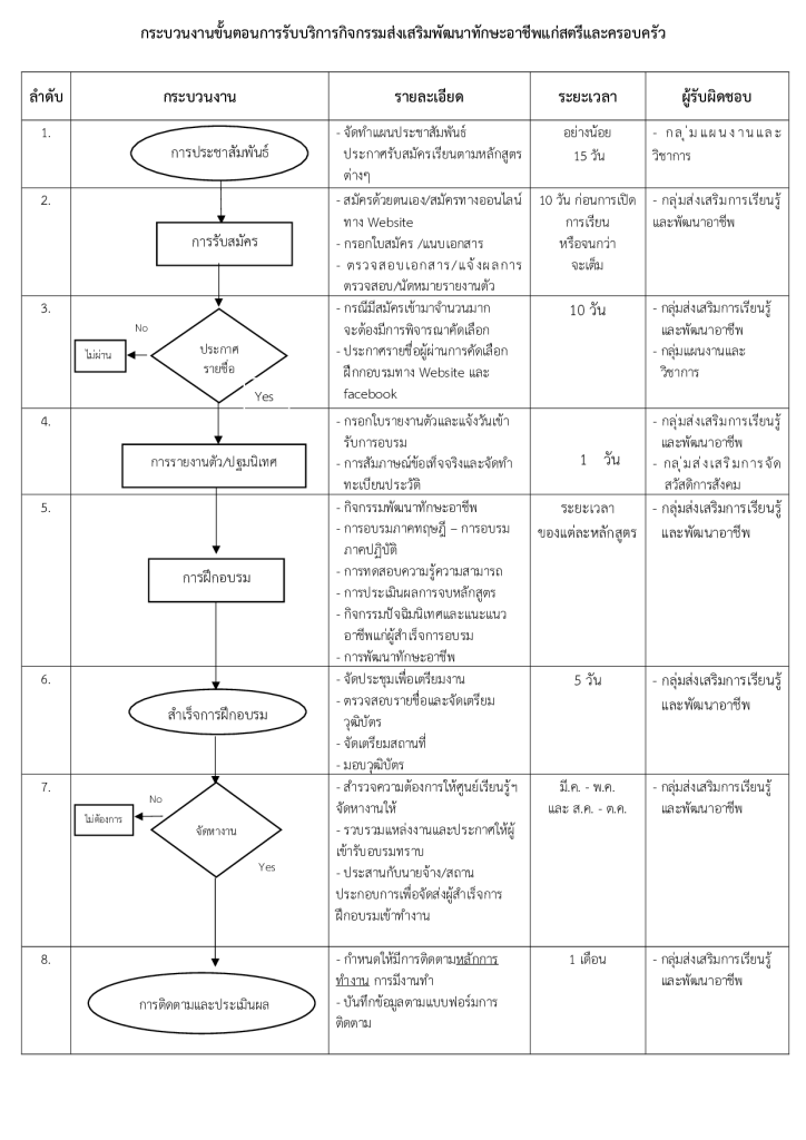 กระบวนงานขั้นตอนการรับบริการ1.กิจกรรมส่งเสริมพัฒนาทักษะอาชีพแก่สตรีและครอบครัว